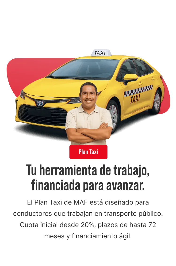 Es un plan dirigido a quienes desarrollan actividades de transporte público en modalidad de Taxi y necesitan adquirir su unidad con respaldo financiero, cuotas cómodas y evaluación clara.