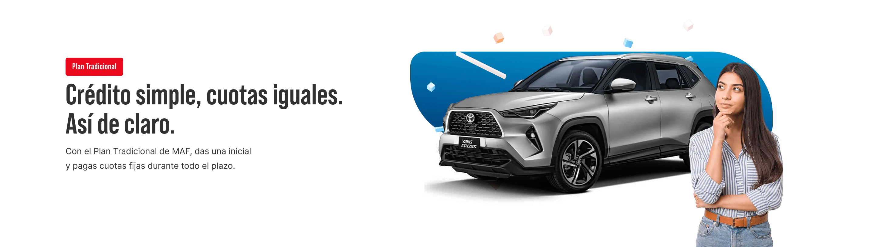 Crédito sujeto a contratación obligatoria de seguro vehicular, mientras que el seguro de desgravamen es opcional. Para lo casos de contratación, puede considerar el ofrecido por MAF o endosar una póliza de la compañía de su preferencia. siempre que este cumpla con los requisitos establecidos y endosado a MAF. Sujeto a evaluación crediticia y validación de los documentos declarados. Para mayor información de requisitos, tasas de interés, comisiones y gastos estarán disponibles en el tarifario difundido en nuestra página Web, el tarifario de crédito vehicular y oficinas de atención. Información difundida de acuerdo a ley N° 28587 y Res SBS 3274-2017.